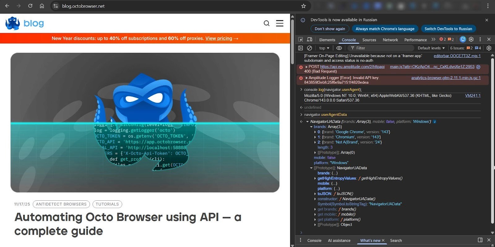 Помимо HTTP-заголовков, подсказки UA-CH доступны и в браузерном JS. В Chromium-подобных браузерах есть объект navigator.userAgentData, из которого сразу можно получить низкоэнтропийные данные: